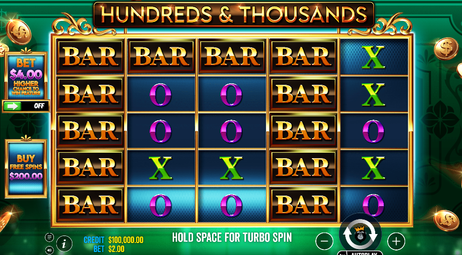 Hundreds and Thousands ဟာ ၅ ဘီး၊ ၅ တန်း ရှိတဲ့ ဗီဒီယို စလော့ ဂိမ်း ပါ။ ပုံမှန် လိုင်း ၁၀၀ ရှိပြီး အနိုင်ရ အခွင့်အရေး များပါတယ်။ ဂိမ်း ရဲ့ အဓိက အပိုင်း က ငွေစက္ကူ သင်္ကေတ တွေ ပဲ ဖြစ်ပါတယ်။ ဒီ သင်္ကေတ တွေ က အရောင်အသွေး စုံ ရှိပြီး ဂိမ်း ကို ပိုမို စိတ်ဝင်စား ဖို့ ကောင်း စေ ပါတယ်။ နောက်ခံ အသံ နဲ့ ရုပ်ရှင် အရည်အသွေး က ရိုးရာ စတိုင် နဲ့ မတူ ပဲ ခေတ်မီ ပါတယ်။ ကျွန်တော် က ဒီ ဂိမ်း ကို ပထမ အကြိမ် ကစားတုန်း က သင်္ကေတ တွေ ရဲ့ လှုပ်ရှား မှု ကို အရမ်း သဘောကျ ခဲ့ ပါတယ်။